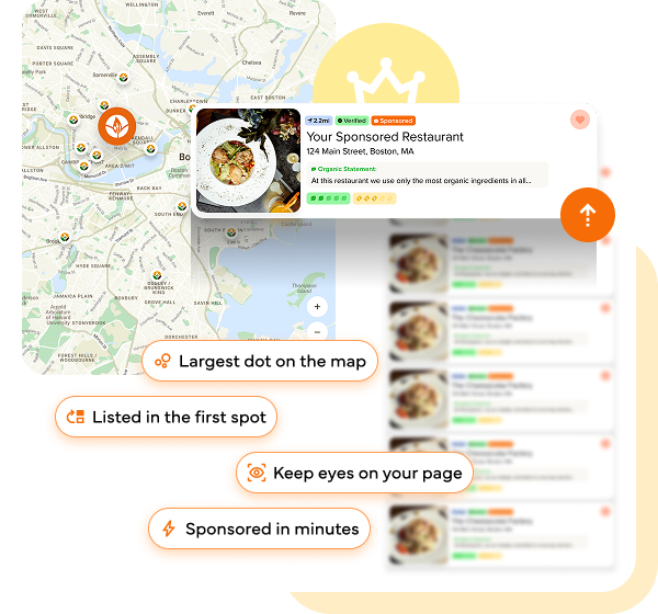 After you’ve claimed your listing for free, you can visit the sponsor your listing page to add your listing to the top city of your choosing. Typically, restaurants will choose the city in which they are located to sponsor. And some restaurants like to add multiple cities and towns nearby to appear in the top spots as well. The idea is that if an organic-minded restaurant goer is looking for a restaurant in Boston, Massachusetts, they might also be open to listings in the neighboring town of Cambridge, Massachusetts. So, a restaurant in Boston might want to sponsor the city of Cambridge as well, so that when someone is looking for a restaurant in Cambridge, they’ll see your listing from Boston in addition to what they find in Cambridge!